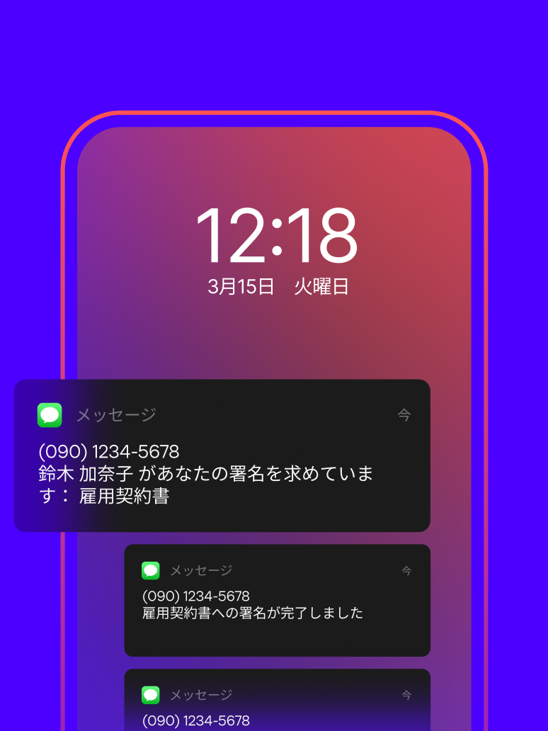 多くの人が電子メールの受信箱に届く大量のメールに圧倒されています。SMS で文書を送信することで、御社は契約・合意文書の署名に一歩先んじることができます。SMS で送信された契約文書は、電子メールでの送信した場合より 65% 早く完了します。**