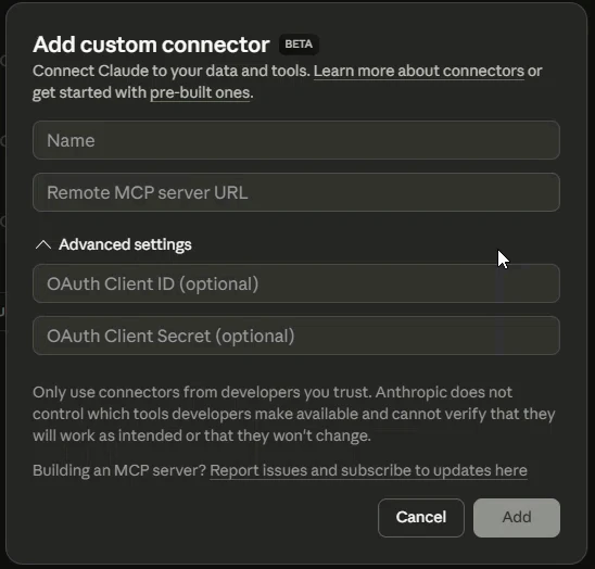 Select Avatar → Settings → Connectors → Add Custom Connector.