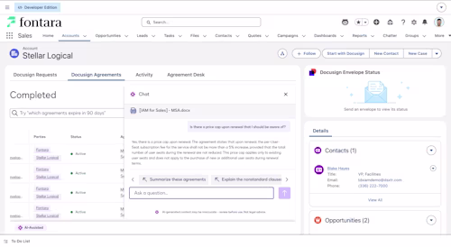 For advanced configurations, Docusign Iris can extract clauses and summaries directly into Salesforce, giving agents and approvers a concise view of key deal terms in context.