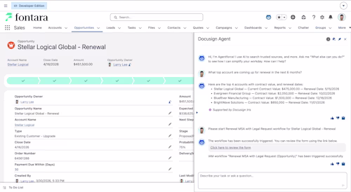 Act: The rep asks Agentforce to generate a renewal agreement and kick off the negotiation process. Agentforce triggers an Apex action that calls the Docusign Maestro workflow API, using a legal-approved template with updated terms applied. Before the workflow fires, the rep reviews an intake form pre-populated with Salesforce data (no manual entry) and submits.