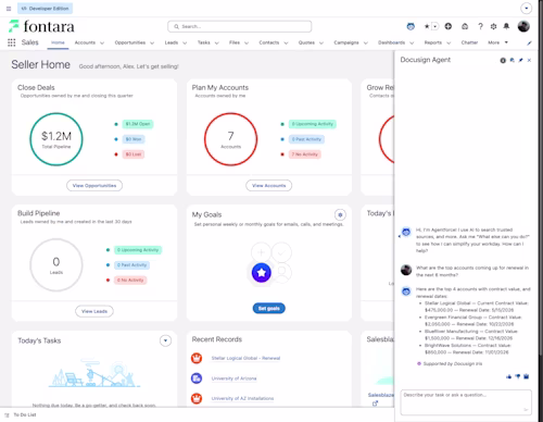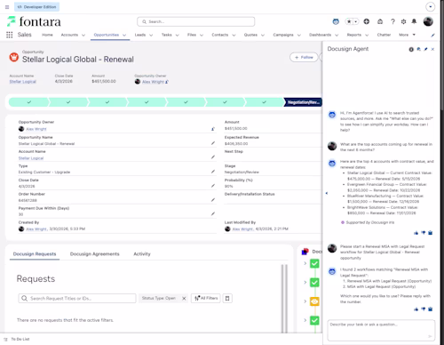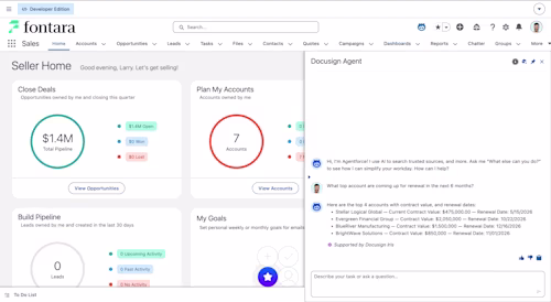 This post walks through how to build that with Docusign IAM and Salesforce Agentforce by connecting Navigator, Iris, and Maestro to Agentforce so your agents can handle the full Discover → Query → Act → Review pattern through natural language, directly inside the CRM.