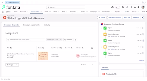 Track: A new Docusign Agreement Request appears on the originating Salesforce record immediately. Status updates in real time through the redlining and signature stages without the rep leaving the CRM.