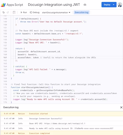 Let’s try this script by launching the startDocusignAutomation() function in our Google Apps Script environment and checking the execution log to see if we are able to obtain our account ID: