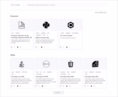 The open-source catalog lists a variety of SDKs, sample apps, code examples, and tools. Selecting a project tile will take you directly to the corresponding GitHub repo, where you can explore, clone, or download the code. Stay tuned for future announcements about how you can also contribute to the Docusign open-source projects.