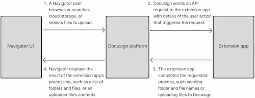 Docusign also recommends performing a test from the Navigator UI to confirm that the extension app is invoked from Navigator, retrieves file and folder information, and uploads the selected files successfully. See File input cloud storage extension Navigator test for details.