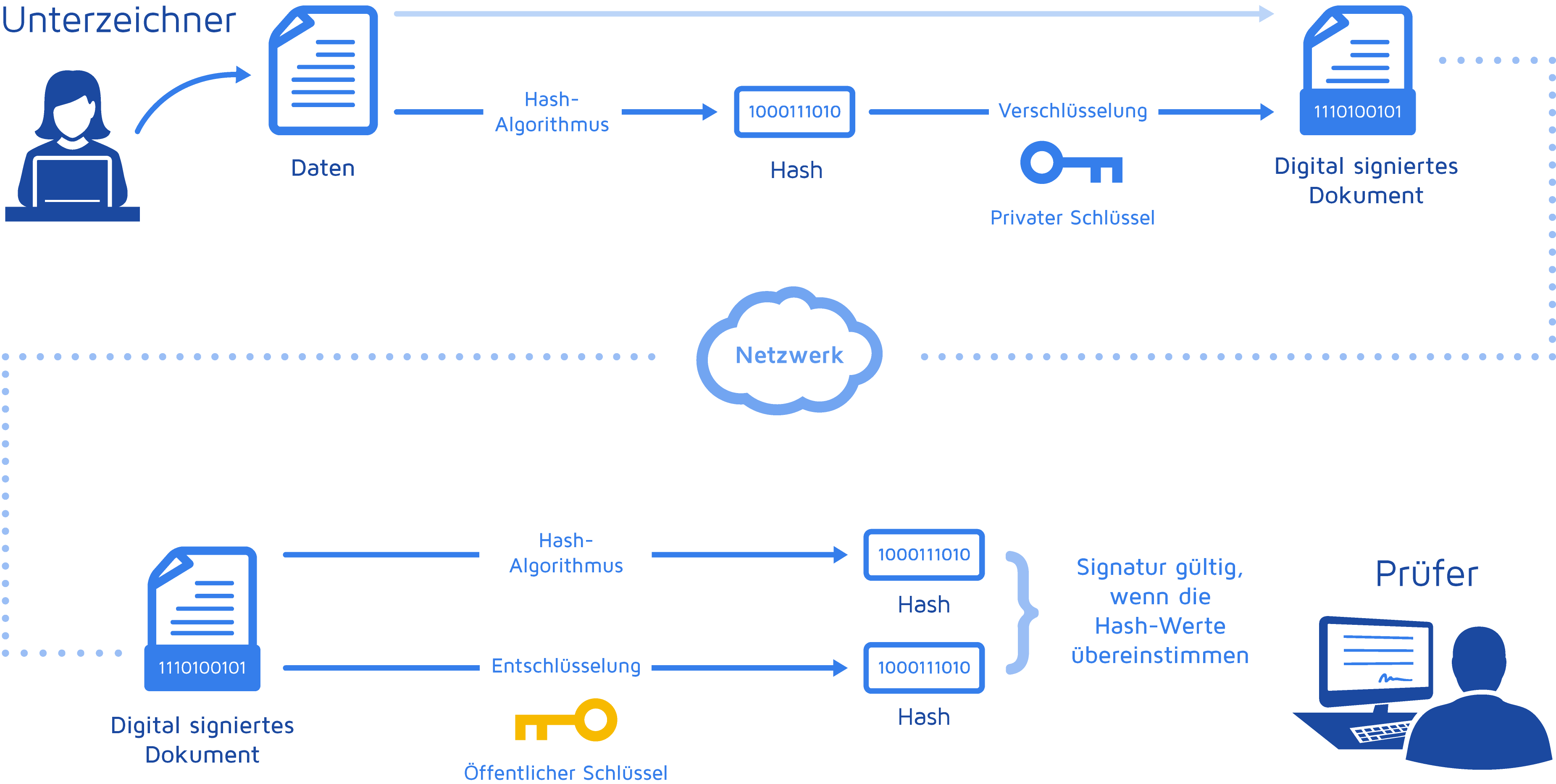 Wenn ein Benutzer ein Dokument elektronisch unterschreibt, wird unter Nutzung des privaten Schlüssels des Unterzeichners eine Signatur erzeugt. Der private Schlüssel wird vom Unterzeichner geheim gehalten. Der mathematische Algorithmus arbeitet wie eine Chiffre und erzeugt Daten zu dem betreffenden Dokument, Hash genannt, und verschlüsselt die Daten. Die resultierenden verschlüsselten Daten sind die digitale Signatur. Die Signatur wird zudem mit einem Zeitstempel versehen. Wenn das Dokument nach der Unterzeichnung verändert wird, ist es ungültig.