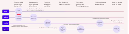 The automotive industry is one example of an industry that is moving to an omnichannel experience to improve customer experience. Throughout the process of buying a vehicle, there are multiple forms and agreements that need to be completed. Customers generally use a range of devices to complete each part of the purchase, from the initial search to the final payment. Below is an outline of the omnichannel journey for a hypothetical automotive customer.