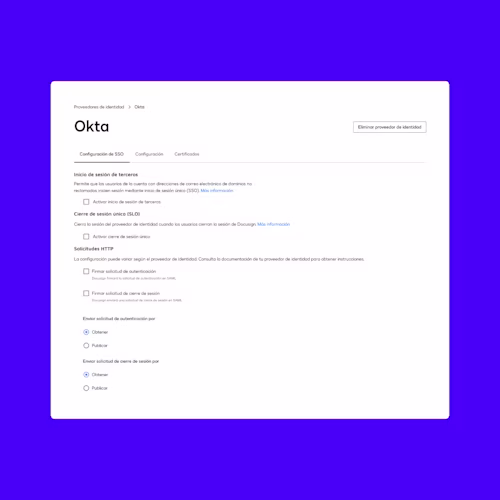 Inicio de sesión único Usa tu proveedor de identidad preferido para optimizar y controlar el acceso a Docusign. | ||