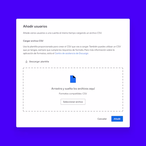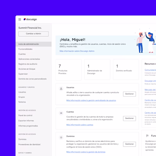 Gestiona fácilmente usuarios, cuentas, informes y tu configuración de seguridad con Docusign Admin.