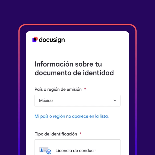 En Docusign, comprendemos que un acuerdo se fundamenta en la identidad y la intención. Aunque la forma estándar de identificar a un firmante es enviar un enlace a su dirección de correo electrónico, ciertos tipos de acuerdos de alto valor o muy confidenciales requieren una verificación de identidad mejorada. Si bien esto puede variar según el país, la región o el sector, la extensa lista de soluciones ofrecidas dentro de Docusign Identify ayuda a los clientes a integrar la técnica de verificación de identidad adecuada para cualquier tipo de acuerdo, manteniendo la experiencia de firma digital, fácil de usar, en cumplimiento y vinculante.