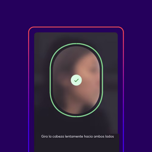 Pide a tus clientes que realicen verificaciones biométricas integradas, al capturar selfies en video y realizar movimientos faciales aleatorios que verifiquen la presencia física y reduzcan los riesgos de grabaciones previas o deepfakes.