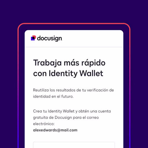 Docusign Identify se refiere a nuestra familia de productos mejorados para la verificación y autenticación de identidad. Estos productos resuelven el problema empresarial de automatizar la verificación de identidad mientras mantienen una experiencia segura, sencilla y fácil de usar que supera los métodos estándar basados en correo electrónico (es decir, los que piden al firmante que confirme su dirección de correo electrónico). Debido al alcance de nuestro portafolio, nuestras soluciones pueden personalizarse según tus necesidades, sin importar el sector o caso de uso.