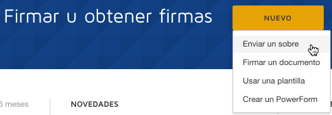 En su cuenta de Docusign, haga clic en NUEVO y, después, haga clic en Enviar un sobre.