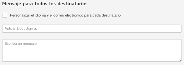 1. Docusign agrega de forma automática un asunto de correo electrónico al cargar un documento. Puede editar este asunto y agregar un mensaje para el destinatario rellenando los campos MENSAJE.