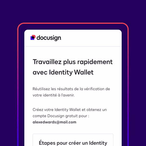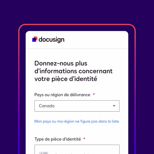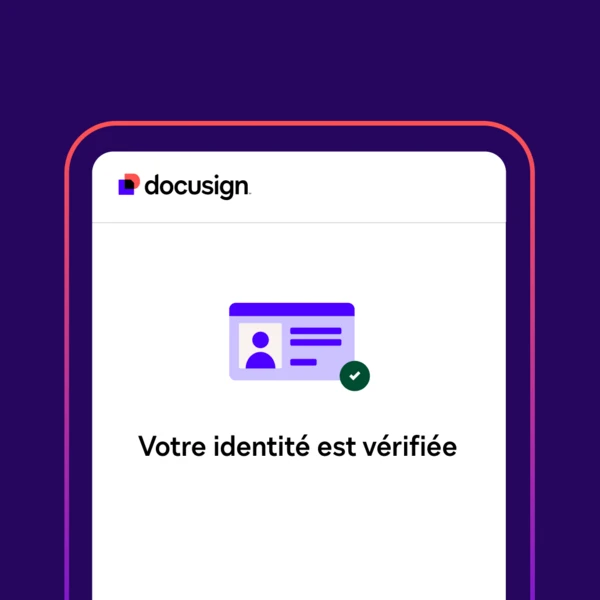 Chez Docusign, nous comprenons que l’accord repose sur l’identité et l’intention. Bien que la méthode standard pour identifier un signataire soit d’envoyer un lien à l’adresse courriel du signataire, certains types d’accords de grande valeur ou très sensibles nécessitent une vérification d’identité renforcée. Bien que cela puisse varier selon le pays, la région ou le secteur, la longue liste de solutions offertes par Docusign Identify aide les clients à intégrer la bonne technique de vérification d’identité pour tout type d’accord donné, tout en gardant l’expérience de signature numérique, conviviale, conforme et exécutoire.