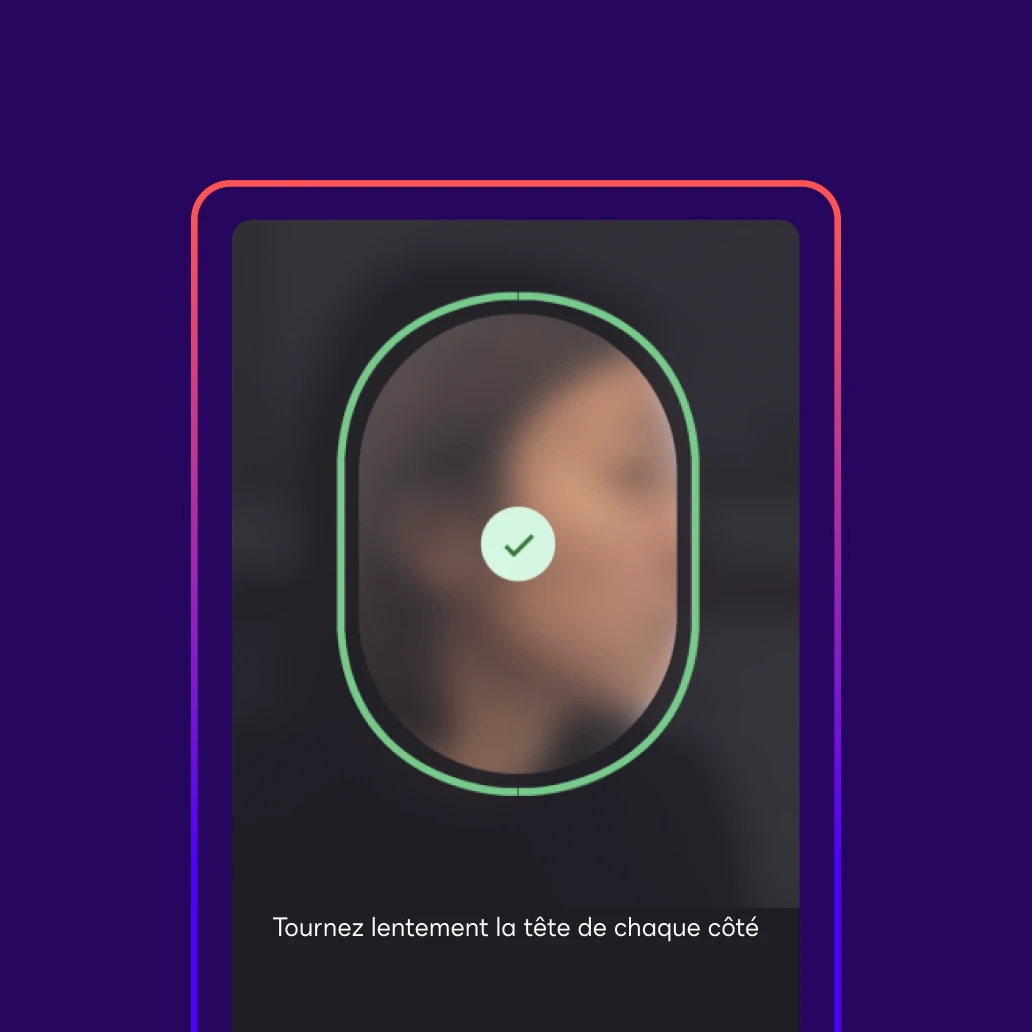 Exigez de vos clients qu’ils passent par des vérifications biométriques intégrées, les amenant à capturer des égoportraits vidéo et à effectuer des mouvements faciaux aléatoires qui vérifient la présence physique et réduisent les risques de préenregistrements ou d’hypertrucages.