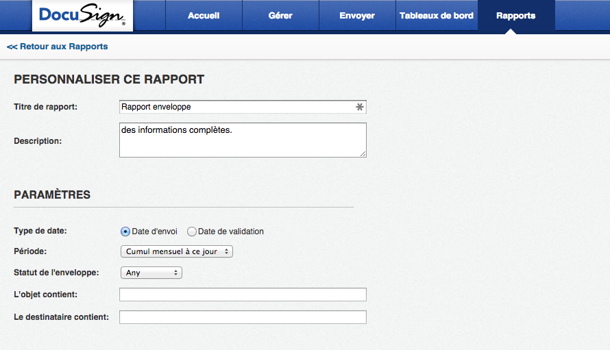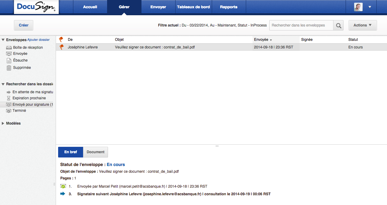 Il vous suffit d'afficher le tableau de bord Docusign pour vérifier le statut de vos documents, ou pour créer des rapports ou consulter les pistes d'audit. Vous savez à tout moment à quel stade du processus de signature se trouve votre document. Définissez des rappels automatiques pour recevoir une notification à chaque étape du processus.