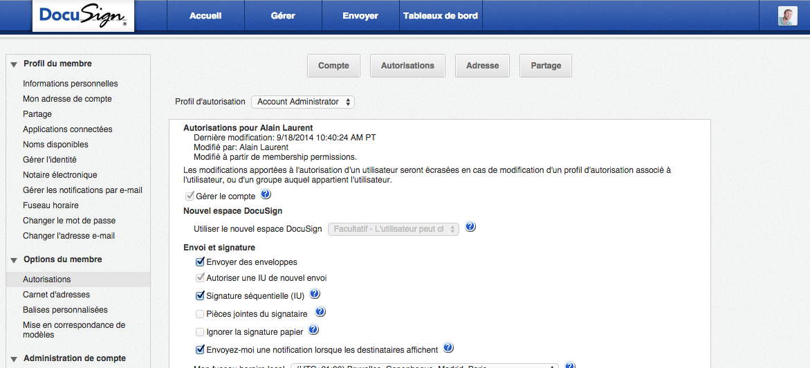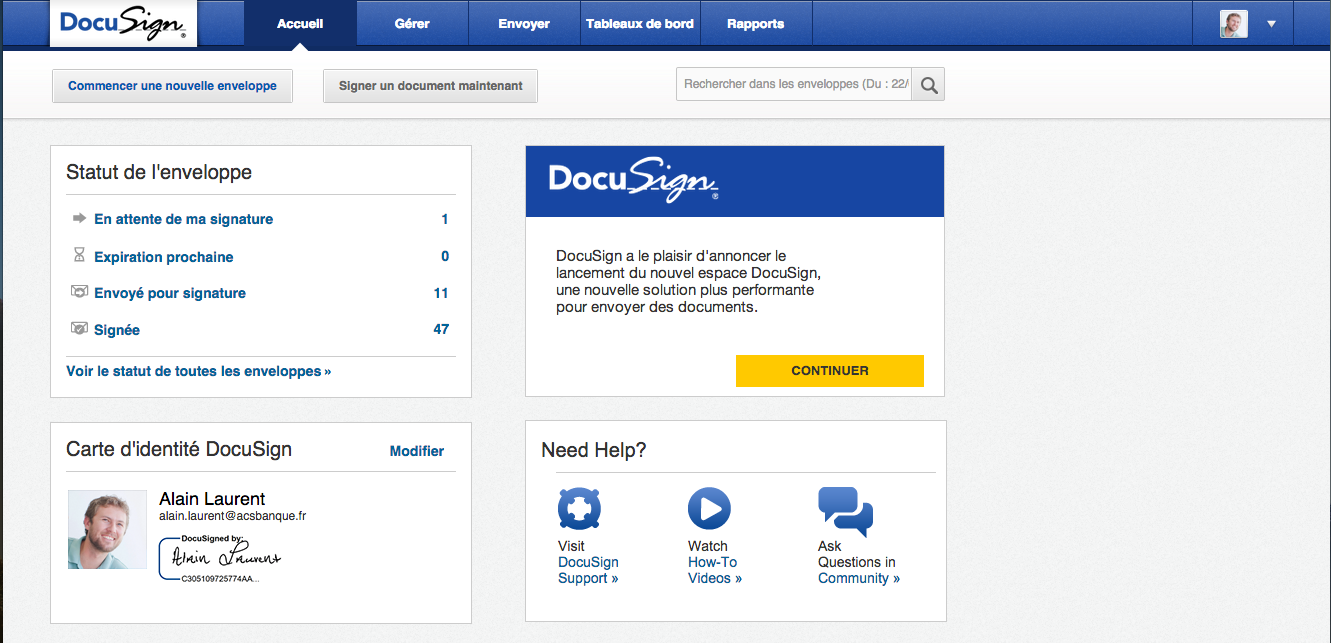 Vous avez la possibilité de gérer les utilisateurs internes, de personnaliser les mails à votre marque (avec un logo ou une image par exemple) et de consulter les documents de l'ensemble de votre entreprise. Les options avancées vous aident à définir des règles de conformité et à les respecter et vous permettent d'accéder à un reporting détaillé. Tout est plus simple, plus sûr et plus rapide qu’avec une signature manuscrite. Docusign est parfaitement conforme à la législation européenne eIdas et prestataire de confiance de l’Union européenne.