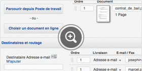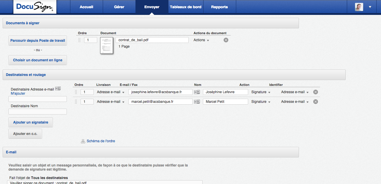 Indiquez le nom et l’adresse e-mail de vos signataires et autres destinataires éventuels (pour consultation, validation, copie, etc) et précisez l’ordre dans lequel ils doivent recevoir le document à signer. Pour encore plus de sécurité, vous pouvez aussi indiquer si vous souhaitez qu’ils signent avec un certificat ou ajouter une authentification par SMS pour être sûr de bien confirmer l’identité de votre signataire.