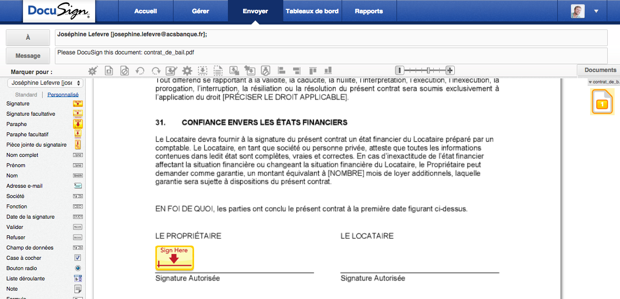 Placez les champs Docusign par glisser-déposer à l'endroit du fichier où vous avez besoin d'une signature, d'un paraphe ou de dates. Vous avez également la possibilité d'ajouter des champs standard ou personnalisés, que les signataires devront remplir. Cliquez ensuite sur Envoyer. Docusign envoie par un mail un lien à chaque destinataire sur lequel ils doivent cliquer pour accéder au document. Une fois signé, le document est stocké de manière sécurisée pour être récupéré plus facilement.