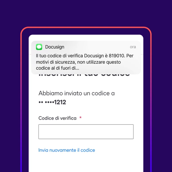 Parte integrante del portafoglio Docusign Identify, se attivato Phone Authentication consente ai firmatari di ricevere una password temporanea (OTP) tramite SMS o chiamata telefonica. Per confermare la propria identità, il destinatario deve inserire il codice inviato al dispositivo utilizzando la tastiera. Solo dopo aver superato con successo la verifica di autenticazione potrà accedere e rivedere i documenti come di consueto.