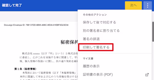 1.通知メールを開封後、画面上部の【▽】をクリックし、【印刷して署名】を選択。