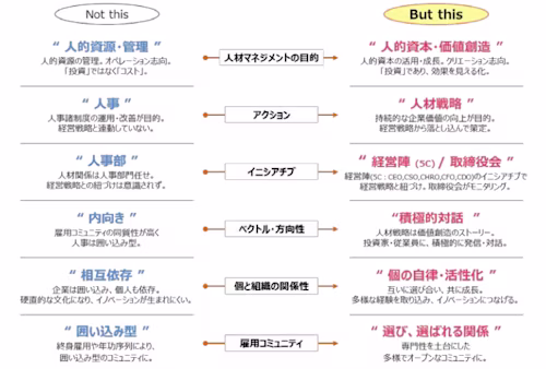 そのほか、人材を資本として捉える考え方は、企業と従業員との関係にも変化をもたらします。人材が資本である以上、企業は従業員を管理するだけでなく、それぞれの個性や能力が発揮されやすい環境を整備しなければなりません。そのため、終身雇用や年功序列などの従来的な囲い込み型の雇用ではなく、専門性を軸に、企業と従業員が選び選ばれる関係の雇用へと転換していく必要があります。