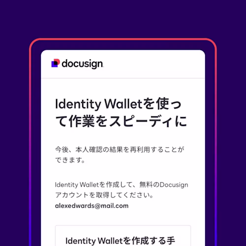 Docusignでは、契約は「当事者と目的」に基づいて作成されるものと認識しています。署名者の識別には、電子メールアドレスにリンクを送信するという標準的な方法が一般的ですが、重要度の高い契約や機密性の高い合意においては、より強固な本人確認が求められます。こうした要件は国・地域・業界によって異なりますが、Docusign Identifyが提供する多様なソリューションは、署名体験のデジタル化、使いやすさ、コンプライアンスの遵守、法的効力を維持しながら、契約の種類に応じた本人確認手法の統合を可能にします。