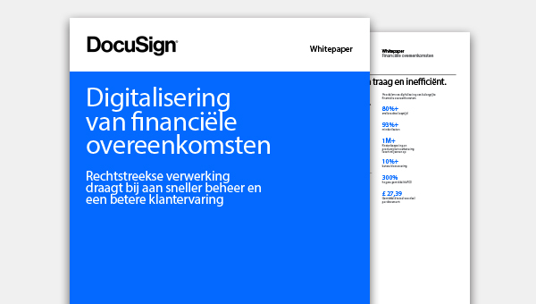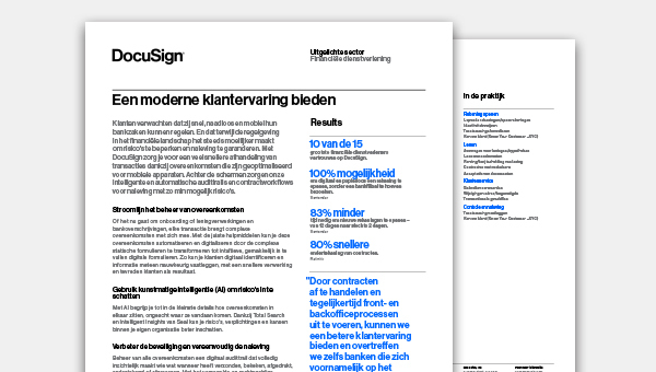 Van onboarding tot service en naleving: de oplossingen van Docusign helpen bij het versnellen van belangrijke bedrijfsprocessen voor retailbanken en kredietverstrekkers, commerciële en zakelijke bankgroepen, vermogensbeheerders en meer.
