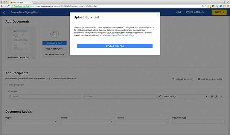 Prompt in Docusign Bulk Send asking a user to add documents into Docusign