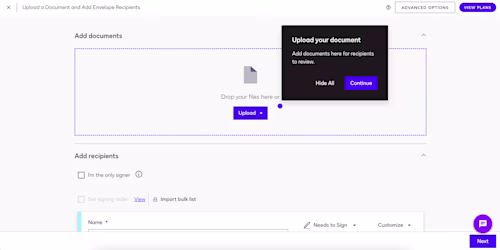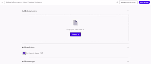 Upload any document. You can drop files in or upload them from your desktop, use a template, or import them from Box, Dropbox, Google Drive, or OneDrive. Check the box that says you’re the only signer.