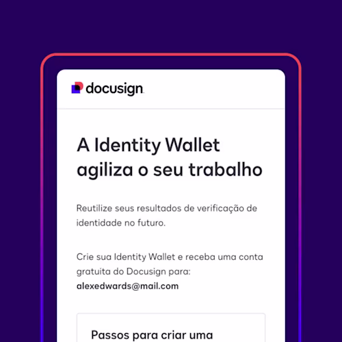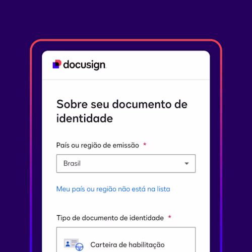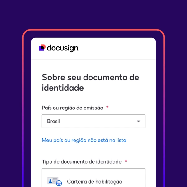 Na Docusign, entendemos que os acordos se baseiam na identidade e na intenção. Embora a maneira padrão de identificar um signatário seja enviar um link para seu endereço de e-mail, certos tipos de acordos de valor elevado ou altamente confidenciais exigem uma verificação de identidade mais avançada. Mesmo variando de acordo com o país, região ou setor, a grande variedade de soluções oferecidas pelo Docusign Identify ajuda os clientes a integrar a técnica certa de verificação de identidade em qualquer tipo de acordo, proporcionando uma experiência de assinatura digital intuitiva, em conformidade e aplicável.