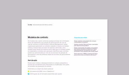 No nosso guia de prontidão, você terá acesso a um grupo de perguntas que vão ajudar a te guiar no processo de decisão sobre seus critérios para uma solução de CLM. Perguntas incluem: