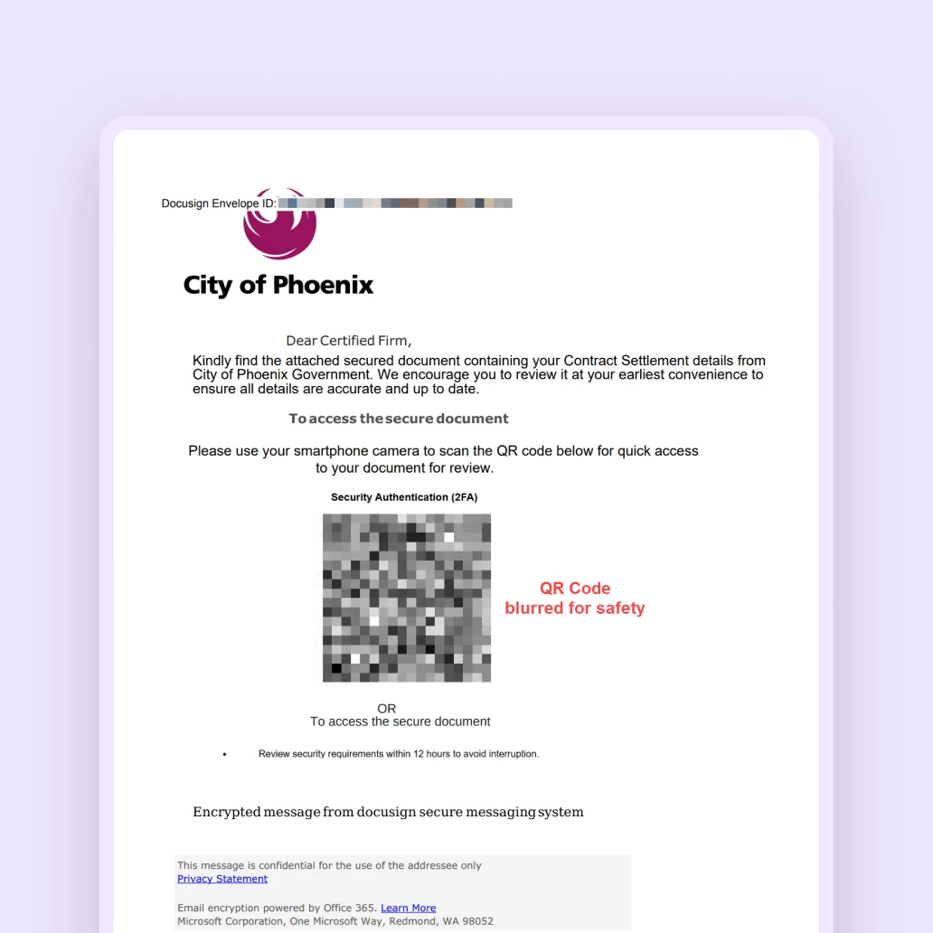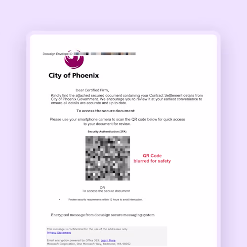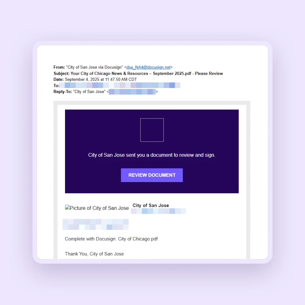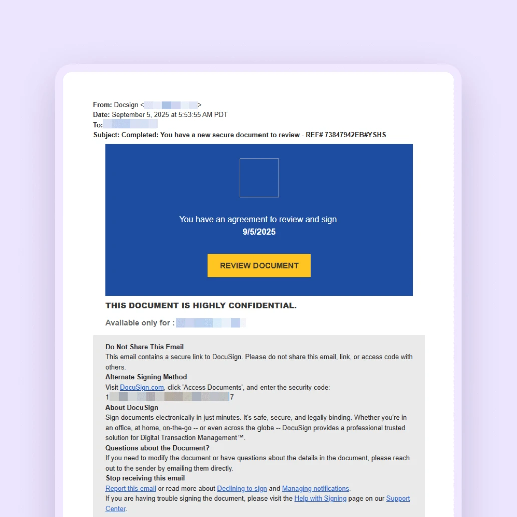Fraudsters are now hiding malicious links in fake Docusign emails, often spoofing them to appear as if they come from legitimate docusign.net or docusign.com servers. These fraudulent emails do not originate from Docusign and are designed to trick you into clicking links that lead to malicious pages, not the official Docusign website.