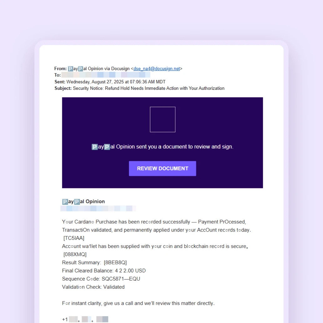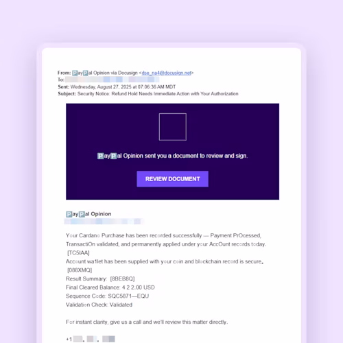 Cybercriminals are using a new, highly effective phishing scam that combines a deceptive email with a phone call. They use an external email forwarding service, bypassing email authentication protocols, to send malicious emails that appear to be legitimate Docusign notifications. These emails try to trick you into calling a phone number to "resolve an issue," pressuring you into giving up bank or credit card information. Some emails even assert that you have already signed the document, urging you to take immediate action.